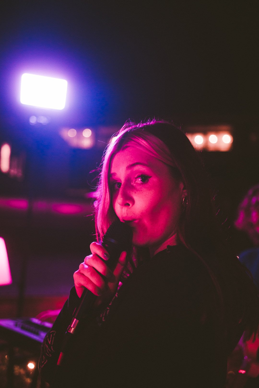 Abby Bella May smiling between songs under warm pink stage lighting.